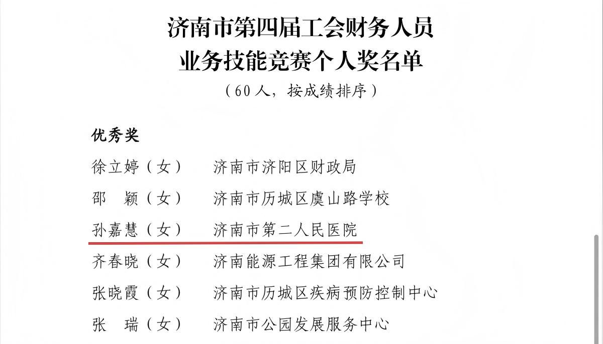 为全面提升工会财务人员专业素养,推动工会财务工作规范化建设,济南市第四届工会财务人员业务技能竞赛于近期举办。济南市眼科医院(济南市第二人民医院)财务科的孙嘉慧凭借扎实的业务基础及良好的现场发挥晋级决赛,并作为济南市医务工会代表队成员参加决赛。日前,决赛结果揭晓,孙嘉慧获评个人优秀奖。
