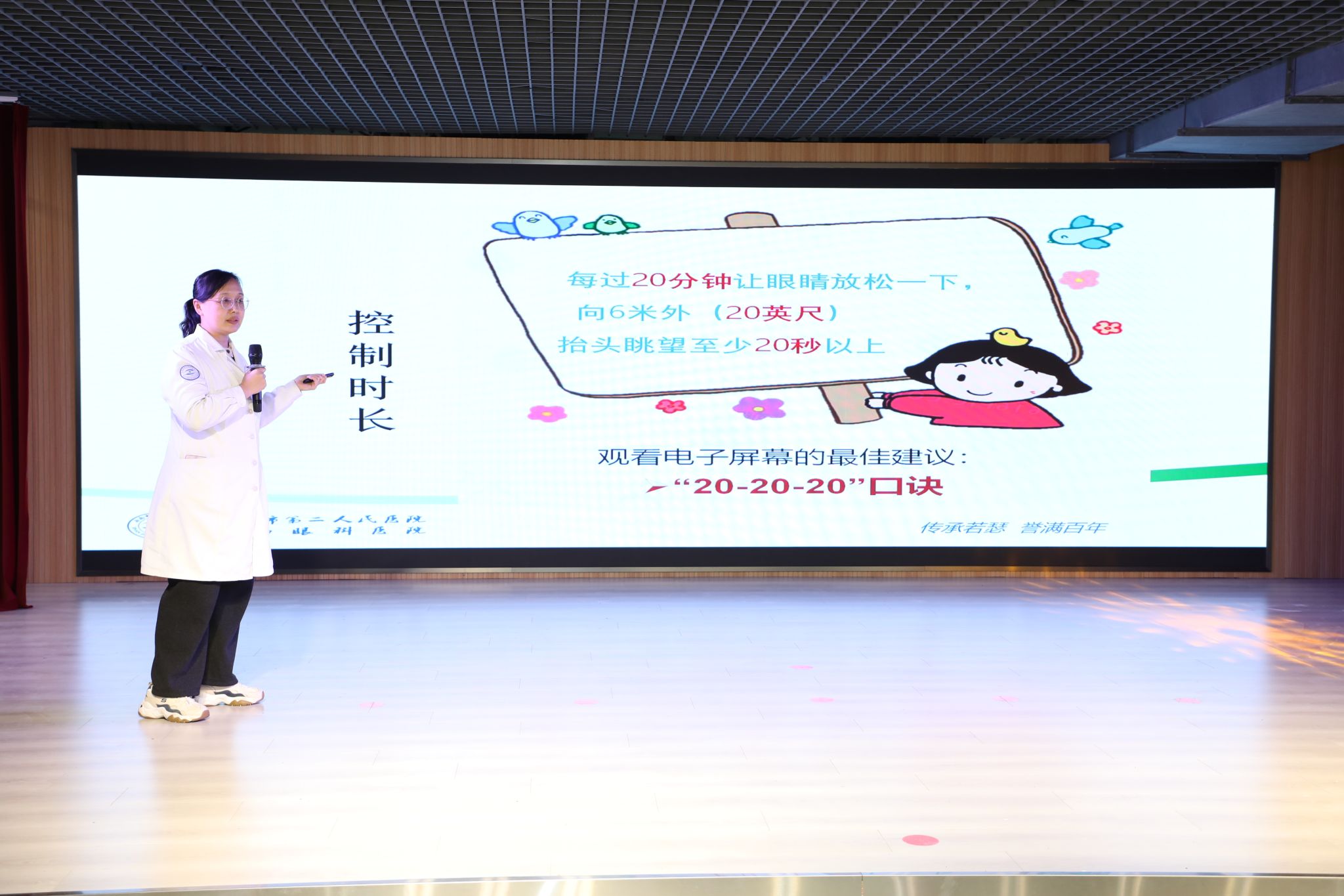 活动现场,眼十科(中医眼科)副主任医师邓丽娅以深入浅出的方式,为市民带来了一场知识盛宴。她首先简要介绍了当前严峻的近视现状,指出近视不仅影响生活学习,高度近视更可能引发严重并发症,危害视力健康。针对近视防控,邓医生提出以下三点建议:其一,每日保证不少于2小时日间户外活动,利用自然光抑制眼轴增长;其二,养成良好用眼习惯,避免不良环境用眼,控制用眼时长,适时远眺休息;其三,确保充足睡眠与均衡饮食,尤其保证儿童青少年睡眠时间,少吃甜食。此外,邓医生还现场示范了眼保健操的正确做法,强调其能通过按摩眼周穴位有效缓解眼疲劳,对防控近视具有积极作用,呼吁大家每日坚持。