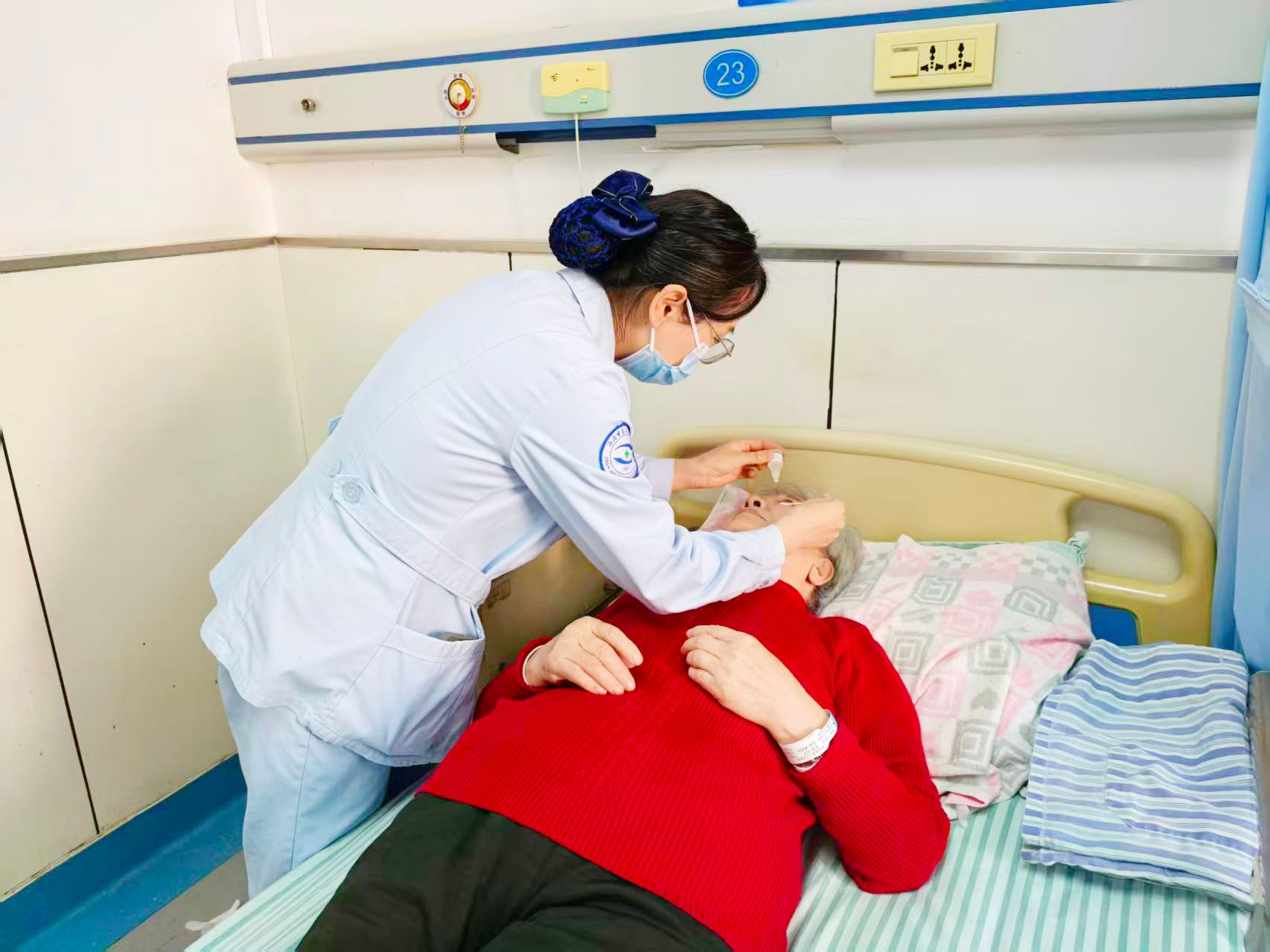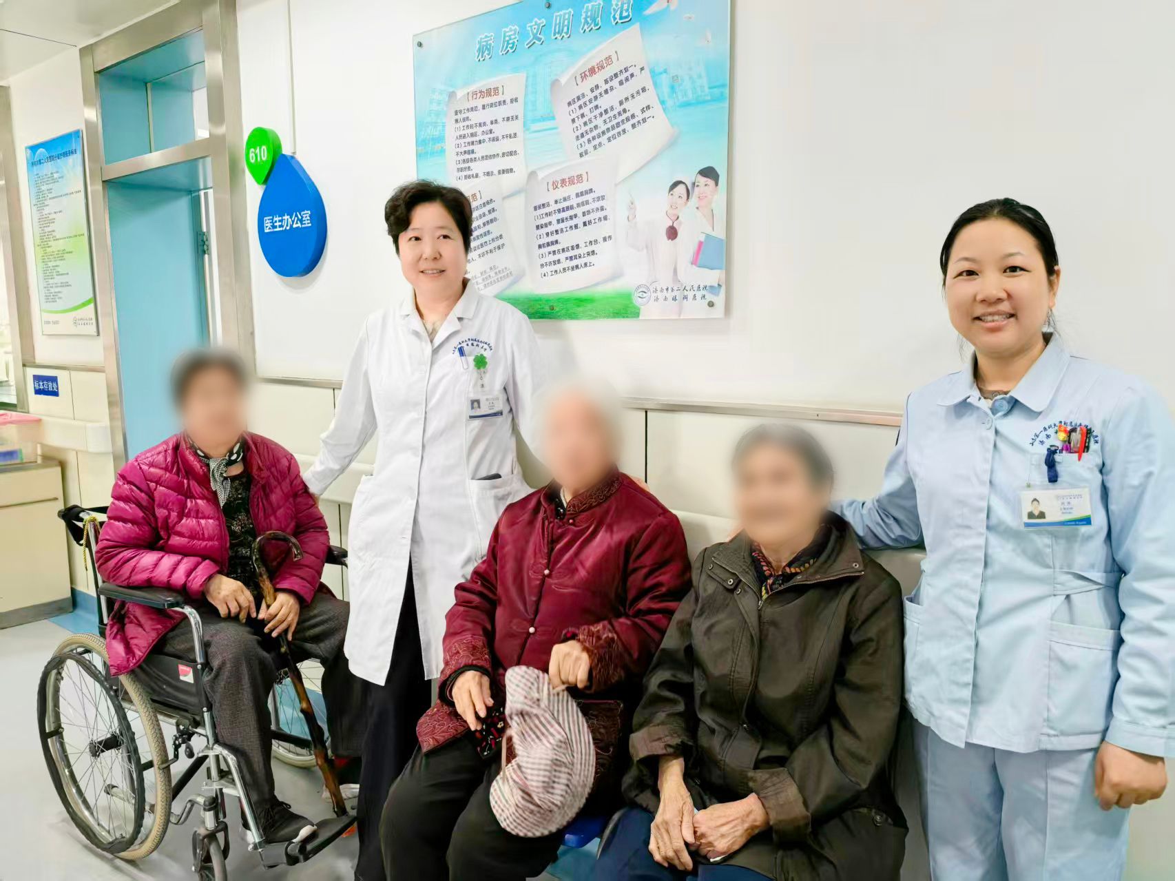 住院期间,眼四科护理团队细致入微的服务更是暖到了老人心坎里。术前,护士们每天定时为老人进行生命体征监测,仔细轻柔地为老人进行眼部清洁,反复演示术前注视训练,怕老人记不住还特意写下简单口诀,让老人可以反复查阅。看到“姐妹团”总爱凑在一起聊天,护士长刘燕特意调整了床位,方便她们彼此照应。术后,由于不放心“姐妹团”状态,护士们更是每隔一小时就到老人身边进行巡视,并轻声询问身体状况,反复叮嘱术后注意事项。由于老人们年纪大,行动不便,护士们全程搀扶陪同检查。日常生活中,护士们主动帮忙打热水、热饭菜,还会为老人理顺凌乱褶皱的衣角。担心老人没出过远门,思念家乡,护士们查房时总会多坐一会儿,陪她们聊聊沂源的风土人情,用亲切的乡音拉近距离,让远离家乡的老姐妹们倍感温暖。