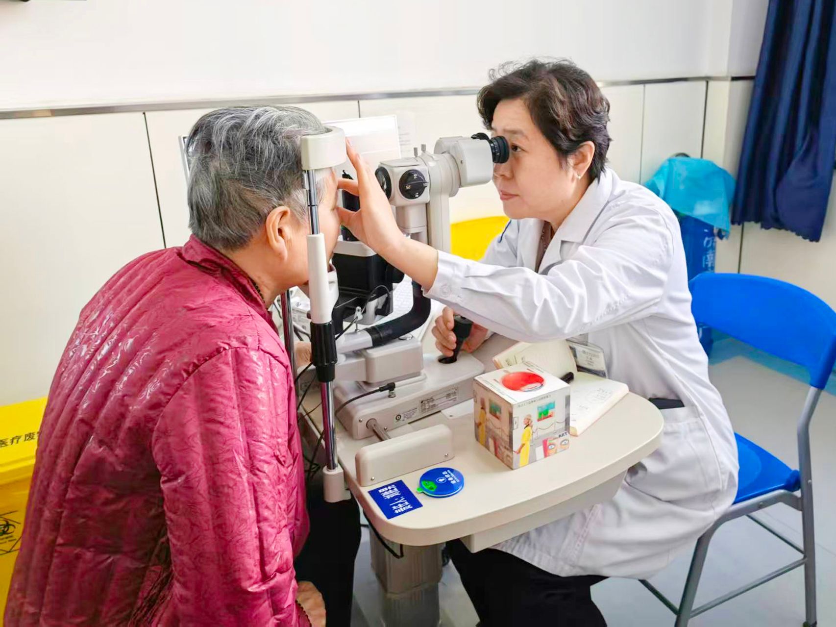 眼四科(白内障一科)主任王晶接诊了解情况后,全面细致的为她们进行了全身检查。通过检查,诊断出有三位老人白内障接近成熟期,晶体核较硬,俗称“大白核”,可以进行手术治疗了,另一位老人由于外眼双侧翼状胬肉较大,影响了白内障人工晶体测算,所以决定先进行翼状胬肉切除术后再进行白内障治疗。