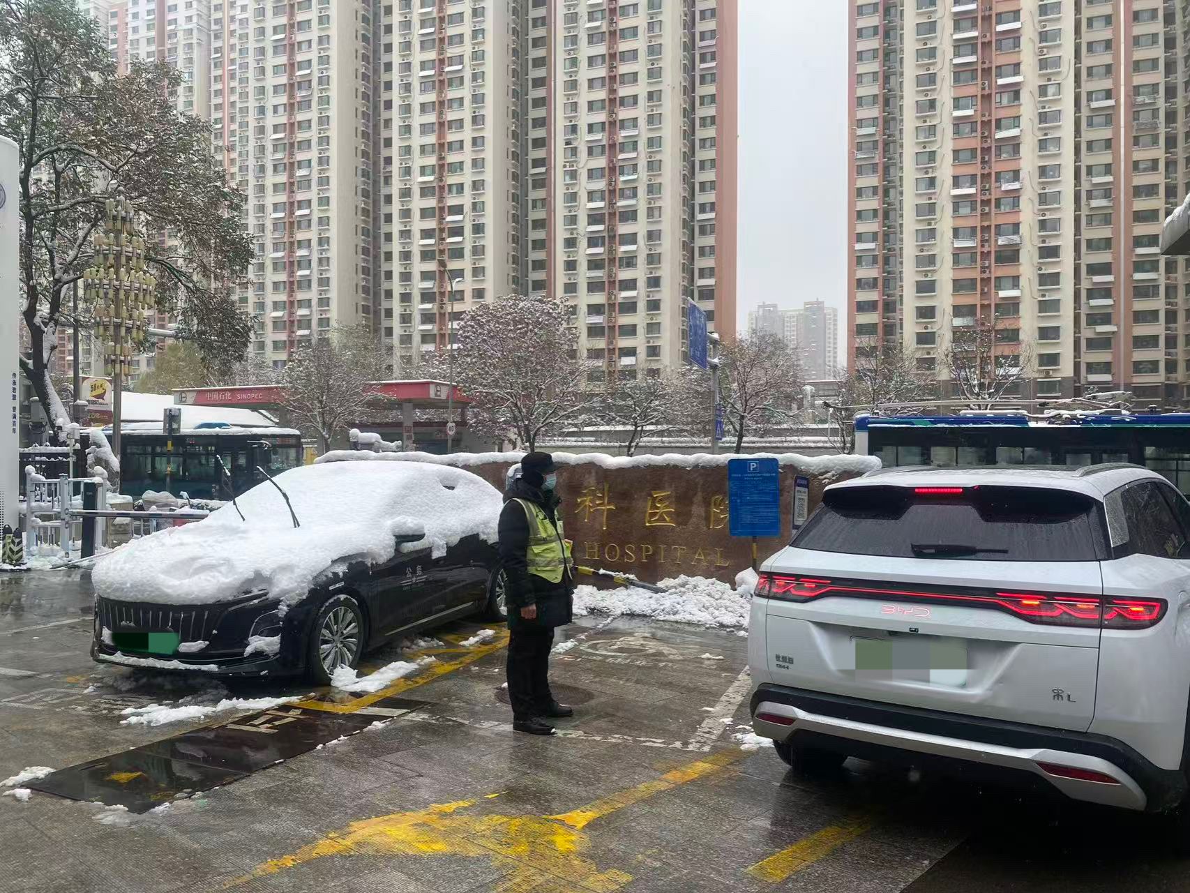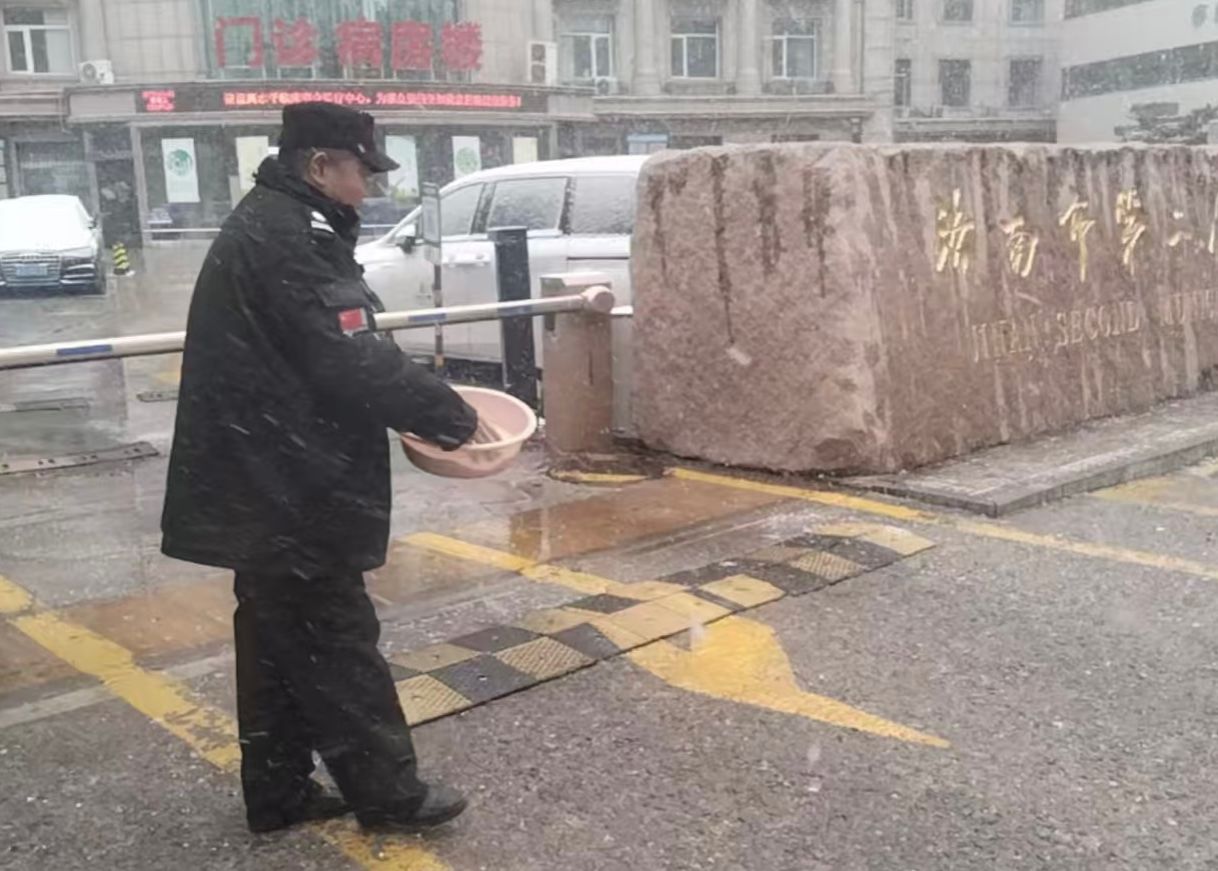 除了清扫积雪,医院还在门诊大厅提前铺设防滑地垫,易滑区域增设“小心地滑”的醒目标识,并安排保安人员加强引导,多项细致举措只为让每一位来院患者都能安心、顺利就医。
