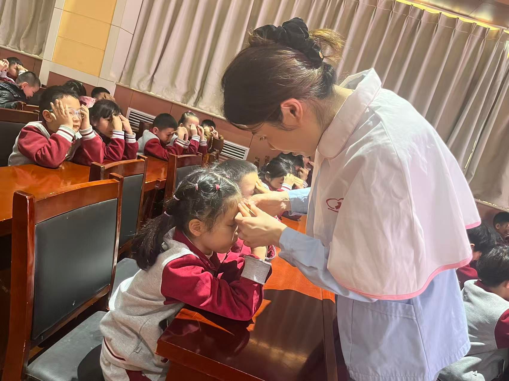 在讲解环节,宿艳主任着重强调了预防近视的重点。她提醒同学们,保持正确的读写姿势至关重要,同时要严格控制电子产品的使用时长。此外,她还鼓励大家积极参与户外运动,让眼睛在自然环境中得到充分放松和休息。为了让同学们更直观、准确地掌握护眼方法,宿艳主任现场亲自示范眼保健操的操作要领,详细讲解每个动作对应的作用和效果。志愿者配合指导同学们如何找准穴位、控制力度和节奏,并督促大家养成每日坚持做眼保健操的良好习惯,以此有效预防近视的发生。