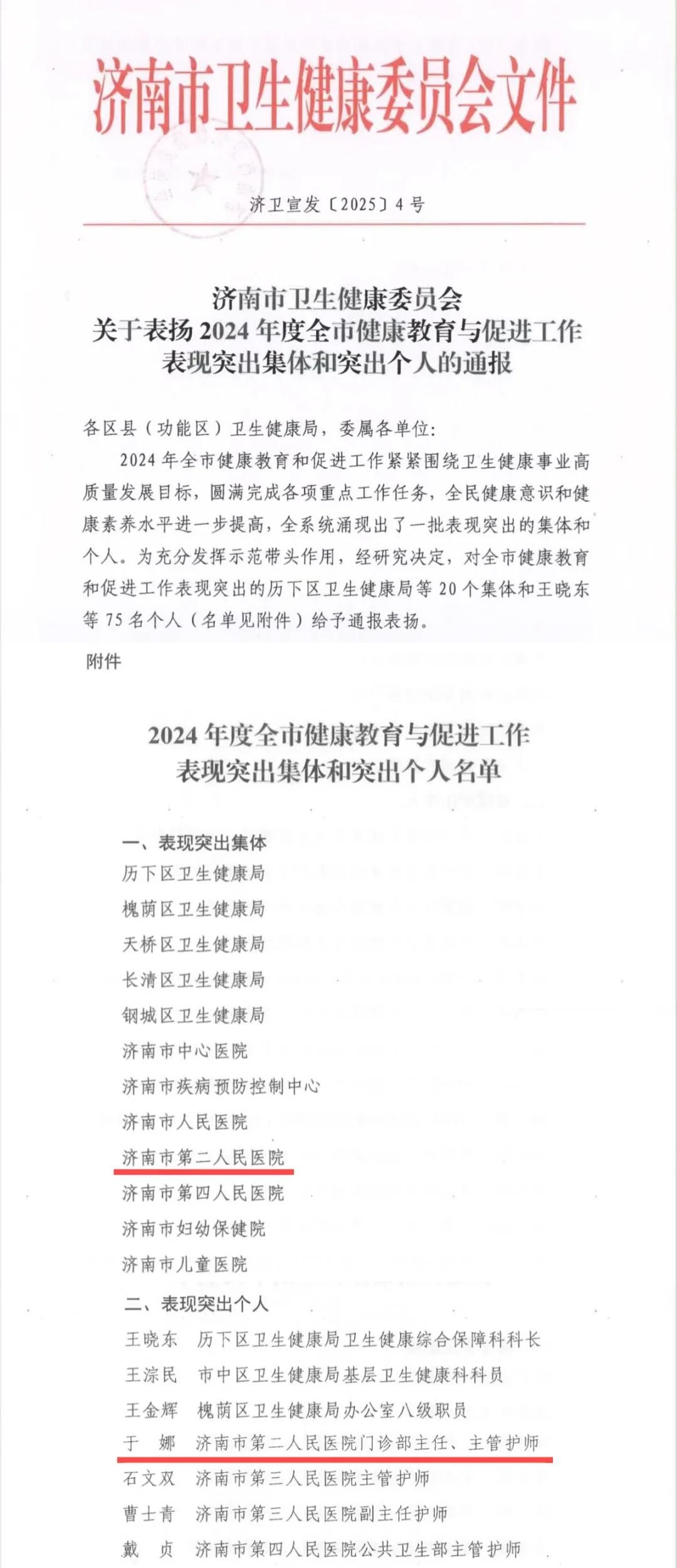 为进一步推动全市健康教育与促进工作深入开展,近日,济南市卫生健康委员会对2024年度在全市健康教育与促进工作中表现突出的集体及个人予以了表扬,济南市眼科医院(济南市第二人民医院)获评“2024年度全市健康教育与促进工作表现突出集体”,门诊部主任于娜获评“2024年度全市健康教育与促进工作表现突出个人”。