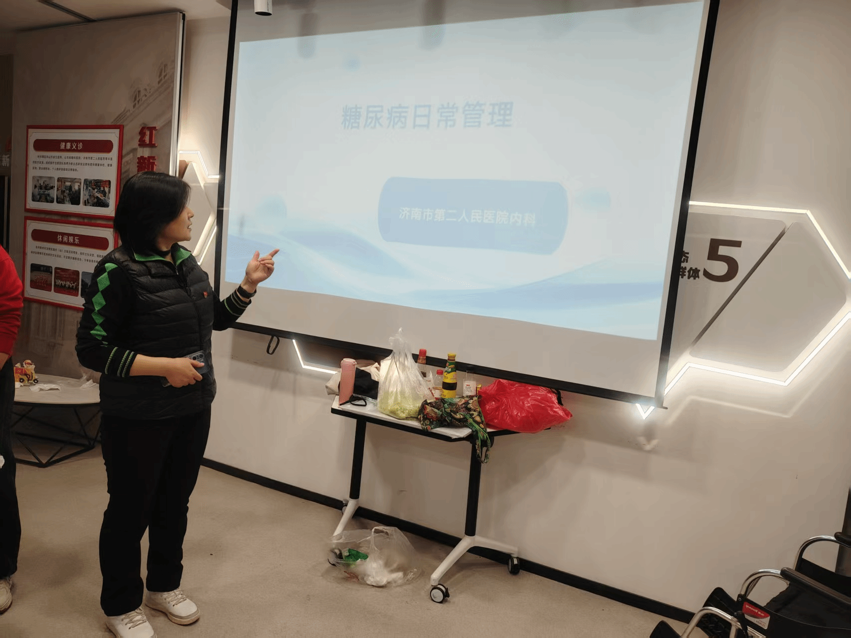 为促进“双报到”社区邻里和谐,提升社区居民幸福感,内科副主任医师张丽为社区老人们讲解“糖尿病日常管理”。通过一张张的幻灯片,张丽医生将饮食管理、科学运动、定期监测指标等内容,转化成浅显易懂的生活语言,通过问答环节,对大家心中的疾病疑虑和不正规的生活方式给予解答、指导,帮助居民提高疾病生存质量、助力健康生活。