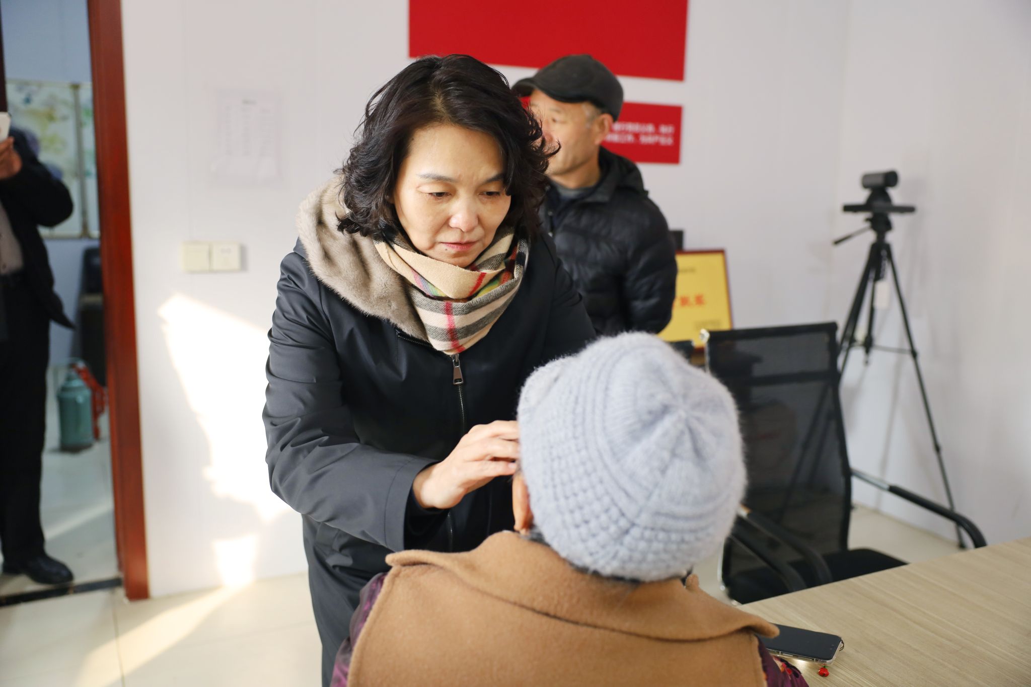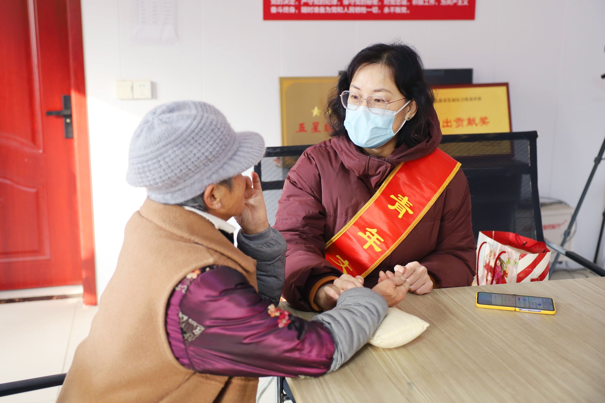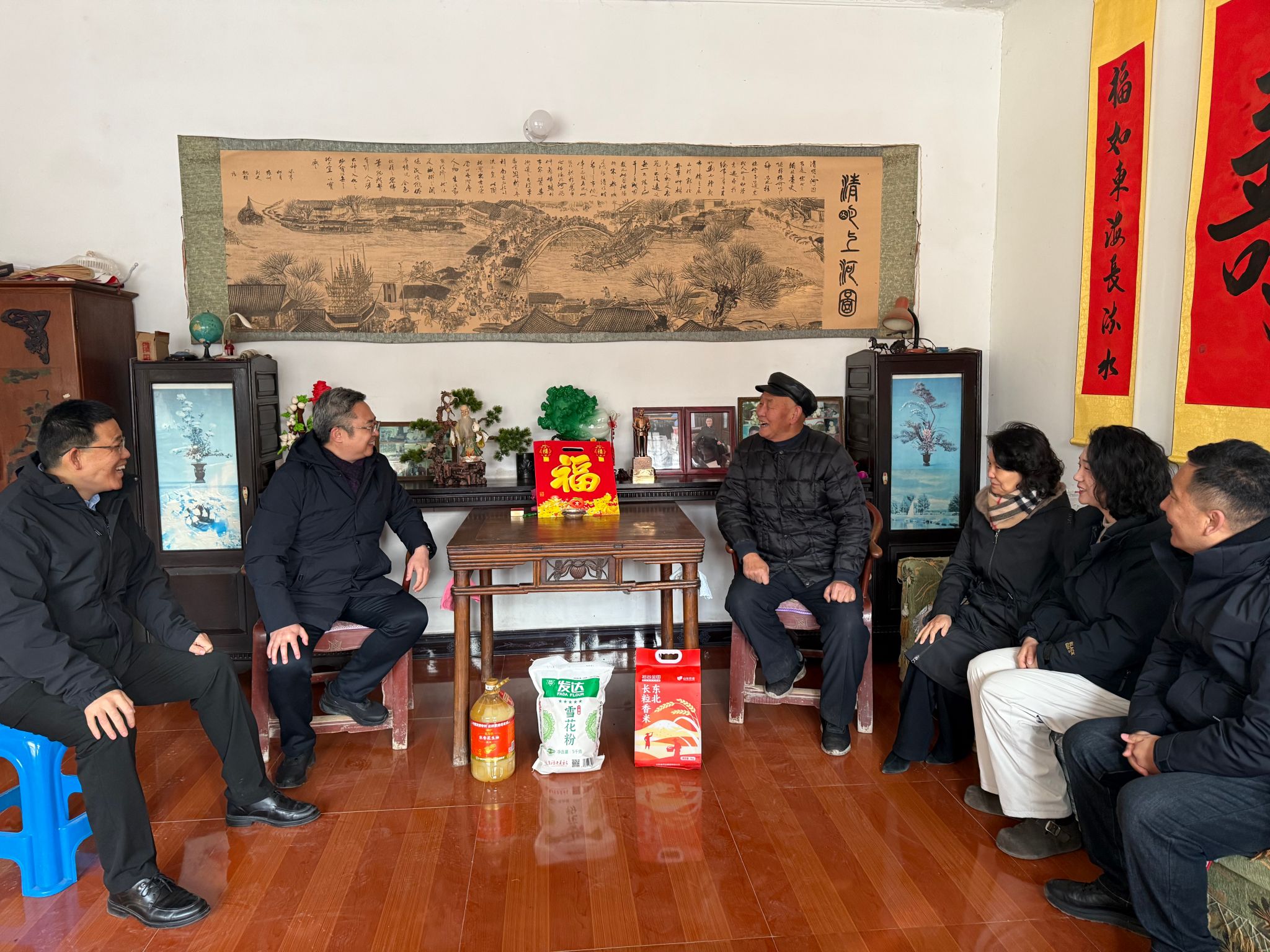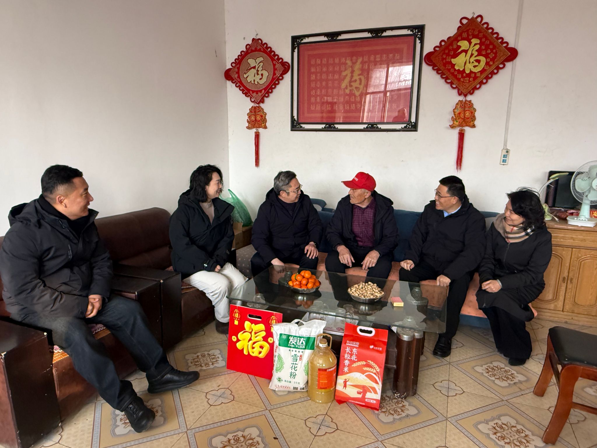 院领导与镇村干部一同深入大毕家村老党员、五保户及困难群众家中走访慰问。每到一户,慰问组都与村民亲切交谈,关切询问他们的身体状况、生活起居与冬季保暖情况,为他们送上新春福字、防寒棉被、优质米面粮油及儿童绘本等慰问品,叮嘱他们注意冬季健康防护,安心迎接新春佳节,让村民在寒冬中深切感受到党组织的关怀与医院的温情。